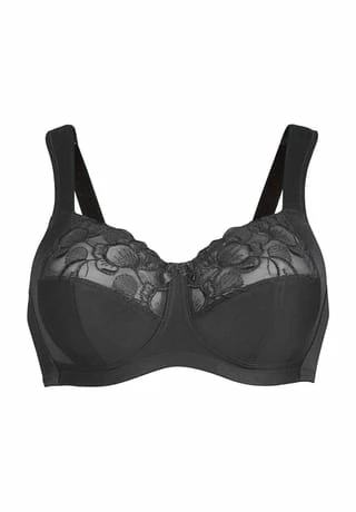 – bügelloser Komfort-BH – weiche Interlockware und kräftige Elastikware – viergeteilte Cups – elastische Stickerei am Obercup – längenverstellbare Komfortträger – zweireihiger Häkchenverschluss am Rücken – hohe Stützfunktion